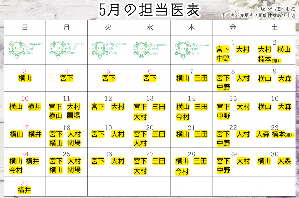 ・・・2026年5月の担当医・・・